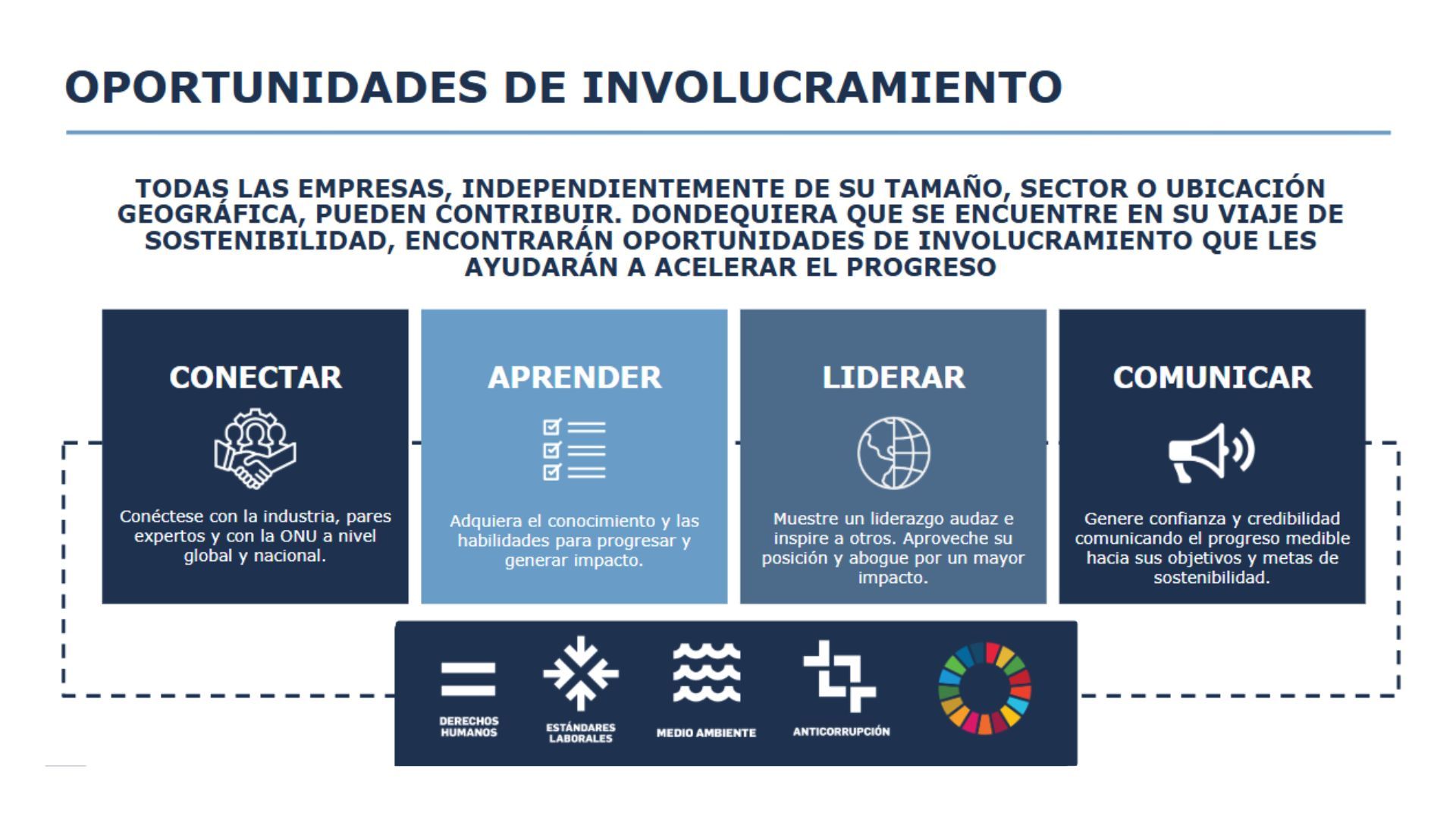- Acelerar la integración de los ODS y los Diez Principios en su estrategia empresarial y en sus operaciones.